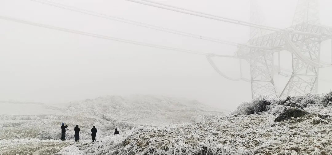 南方電網(wǎng)廣西桂林靈川供電局青年突擊隊帶著儀器前往線路覆冰線段開展觀冰巡視工作。(陸國輝 攝)