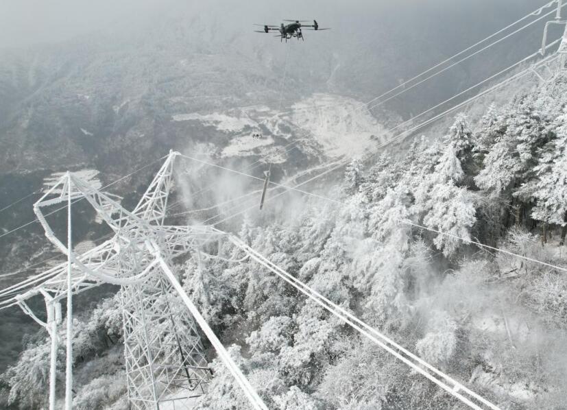 在海拔2800米的雅安市漢源縣蓑衣嶺,氣溫降至零下7℃,連接雅安至樂山的220千伏漢音輸電線路覆冰厚度已達(dá)10毫米。國(guó)網(wǎng)雅安供電公司組織電力運(yùn)維人員持續(xù)開展冰情監(jiān)測(cè),運(yùn)用無人機(jī)搭載除冰裝置撞擊覆冰導(dǎo)線完成帶電除冰,及時(shí)消除輸電線路安全隱患。