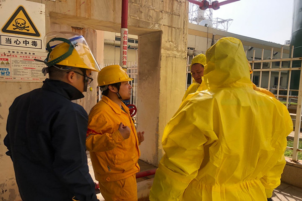 在監(jiān)護人員的指導下,各演練人員通過實戰(zhàn)演練對酸儲罐泄漏的處理有了更直觀的認識,并熟悉了防護用品的穿戴要求,能夠按照演練要求進行相關(guān)操作。演練結(jié)束后化學專工高淵、馬潔和發(fā)電部副部長孫偉迪對本次演練進行評價,并提出了整改意見。