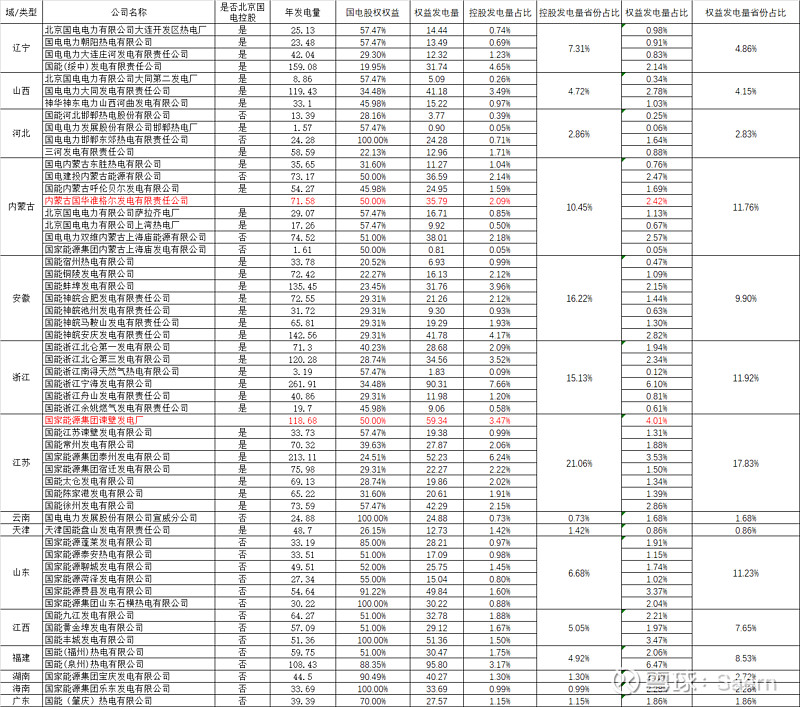 國電的火電有一些明顯的特點,就是控股火電發(fā)電量多,權(quán)益相對低,也有人質(zhì)疑國電的火電資產(chǎn)差,位置不好。那么國電的火電到底分布如何呢,經(jīng)過一個個的股權(quán)查詢(紅色兩家還沒查到用50%替代,后續(xù)翻報表后更新),按照2022年全年剝離寧夏火電后的數(shù)據(jù),我做了統(tǒng)計和分析。大家可以看結(jié)論,到底如何大家自己判斷。$國電電力(SH600795)$ $大唐發(fā)電(00991)$ $華電國際(SH600027)$ 華能國際