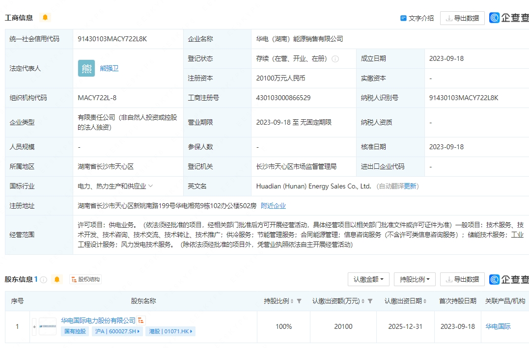 企查查APP顯示,近日,華電(湖南)能源銷售有限公司成立,法定代表人為熊強(qiáng)衛(wèi),注冊資本2億余元,經(jīng)營范圍包含:儲能技術(shù)服務(wù);工業(yè)工程設(shè)計(jì)服務(wù);風(fēng)力發(fā)電技術(shù)服務(wù)等。企查查股權(quán)穿透顯示,該公司由華電國際100%控股。(每日經(jīng)濟(jì)新聞)