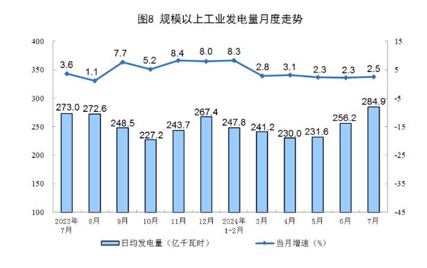 8月15日,國家統(tǒng)計(jì)局發(fā)布數(shù)據(jù)顯示,規(guī)模以上工業(yè)(以下簡稱“規(guī)上工業(yè)”)電力生產(chǎn)略有加快。7月,規(guī)上工業(yè)發(fā)電量8831億千瓦時,同比增長2.5%,增速比6月加快0.2個百分點(diǎn);規(guī)上工業(yè)日均發(fā)電284.9億千瓦時。1—7月,規(guī)上工業(yè)發(fā)電量53239億千瓦時,同比增長4.8%。