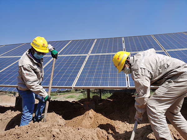 該光伏電站地處內(nèi)蒙古阿拉善烏蘭布和沙漠邊緣,現(xiàn)場(chǎng)土質(zhì)多為粉細(xì)砂,堅(jiān)土層較薄,不利于光伏站內(nèi)箱式變壓器、逆變器、匯流箱及光伏組串等設(shè) 備基礎(chǔ)穩(wěn)固,特別在雨季時(shí)期,雨水對(duì)光伏組件基礎(chǔ)沖刷影響較大。該公司運(yùn)維人員及時(shí)開(kāi)展光伏組件基礎(chǔ)土方回填工作,現(xiàn)場(chǎng)采用機(jī)械填土和人工補(bǔ)填方式進(jìn)行,一邊裝載車(chē)和挖掘機(jī)配合,將土方填至光伏板背光面,另一邊人工回填光伏板正下方區(qū)域。在控制土方高度時(shí),運(yùn)維人員嚴(yán)格按照規(guī)范要求,夯實(shí)并填平土方,保證光伏方陣組件最下端與地面距離不低于0.3米,確保光伏板受光良好。在控制加固工期期間,該公司運(yùn)維人員早出晚歸、雷厲風(fēng)行,歷時(shí)兩天,順利完成任務(wù)區(qū)的基礎(chǔ)加固工作。