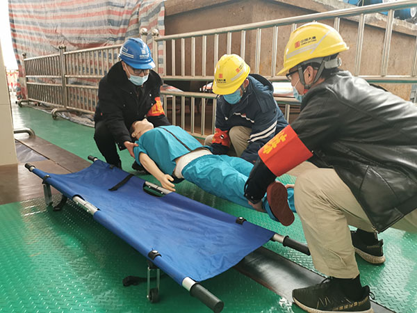 此次演練在主安裝廠2號(hào)機(jī)組大修現(xiàn)場(chǎng)進(jìn)行,模擬兩名施工人員在轉(zhuǎn)輪支架3米多高的平臺(tái)上焊接縫隙,一名工作人員未系安全帶進(jìn)行作業(yè),不慎摔倒墜落。該公司相關(guān)部門(mén)接到報(bào)告后,迅速啟動(dòng)應(yīng)急機(jī)制,立即撥打120緊急電話,并通知應(yīng)急救援隊(duì)趕赴事故現(xiàn)場(chǎng)。救援現(xiàn)場(chǎng),應(yīng)急隊(duì)員迅速判斷危險(xiǎn)情況,并檢查傷員傷勢(shì),大家齊心協(xié)力將傷員轉(zhuǎn)移到安全地帶,拉起警戒線,對(duì)傷員進(jìn)行緊急檢查。救援人員發(fā)現(xiàn)傷者腿部骨折,無(wú)法行動(dòng),立即進(jìn)行骨折包扎急救,按部就班、細(xì)致謹(jǐn)慎對(duì)傷口進(jìn)行消毒、止血、固定、包扎。最后,傷員被順利送往醫(yī)院。