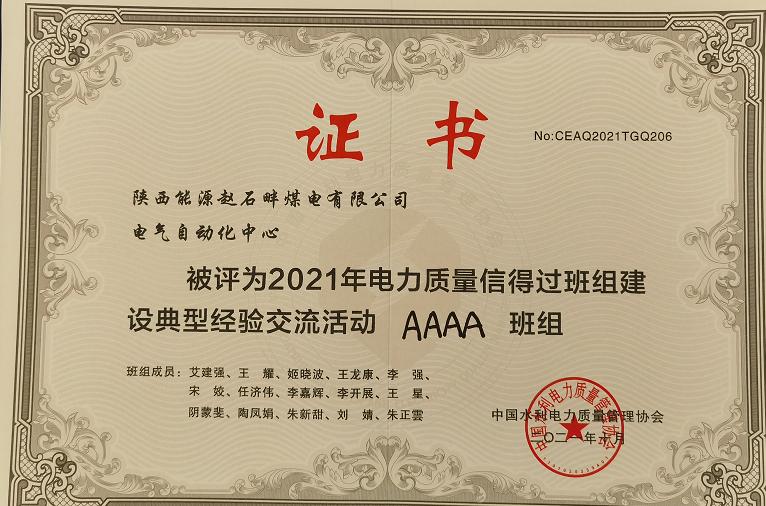中國電力網(wǎng)訊 10月11日至10月15日, 2021年電力行業(yè)質(zhì)量信得過班組建設(shè)交流發(fā)布會(huì)在合肥召開,陜投集團(tuán)趙石畔煤電設(shè)備部電氣自動(dòng)化中心被評為“電力質(zhì)量AAAA級質(zhì)量信得過班組”。