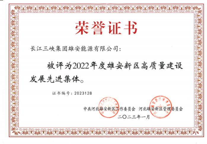 本網(wǎng)訊(任華錚)近日,河北雄安新區(qū)黨工委、管委會授予三峽雄安公司“2022年度雄安新區(qū)高質(zhì)量建設(shè)發(fā)展先進(jìn)集體”榮譽(yù)稱號。據(jù)了解,雄安新區(qū)120多家中央企業(yè)所屬單位中,共有12家獲此榮譽(yù),其中三峽雄安公司是唯一一家央企二級機(jī)構(gòu)。