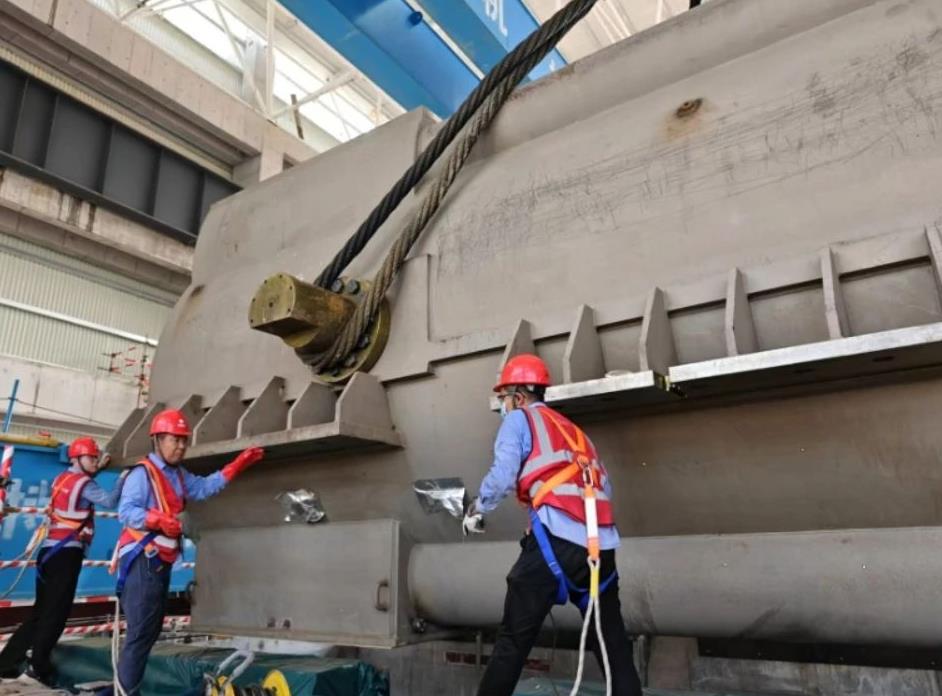 發(fā)電機(jī)定子作為主廠房內(nèi)最重的單體設(shè)備,長10.3米、寬4.868米、高4.7米,重達(dá)367噸。為確保發(fā)電機(jī)定子吊裝平穩(wěn)、就位精準(zhǔn),項(xiàng)目建設(shè)團(tuán)隊(duì)組織制定詳細(xì)的吊裝施工方案,提前做好設(shè)備和工器具保障,從場外運(yùn)輸至場內(nèi)卸車全過程反復(fù)推演,逐項(xiàng)落實(shí)。同時,在吊裝期間實(shí)施全程監(jiān)督,嚴(yán)控安全質(zhì)量,確保整個吊裝過程安全、有序、可控。