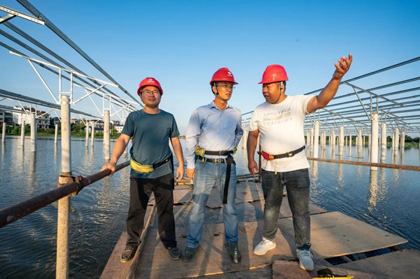 “從乘浮船‘踩點(diǎn)’開始,工作盡量提前,凡事親力親為,特別是三伏天后天氣超熱,我們避開最熱時(shí)段,早上4點(diǎn)就到現(xiàn)場,業(yè)主心疼我,我心疼工友,工友自然干勁足。打樁效率、質(zhì)量直接關(guān)系到后續(xù)光伏面板安裝進(jìn)度和全容量并網(wǎng)任務(wù),不打好提前量,對不起業(yè)主方的信任厚愛……”,7月16日,茶從湖標(biāo)段已打完4800余根樁基,完成80%以上的任務(wù),光伏面板安裝進(jìn)度超20%。8月15日再找他時(shí),早已在江埠項(xiàng)目堯咀光伏區(qū)鏖戰(zhàn)了。