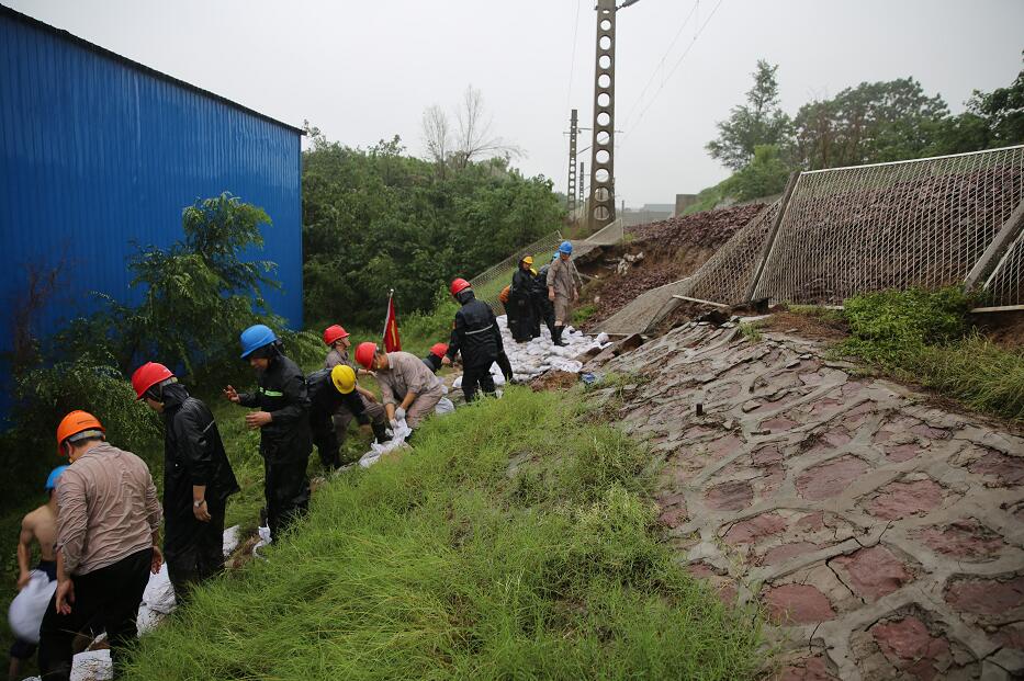 “鐵路專用線路場外區(qū)域索河鐵路大橋北段西側(cè)600米處護(hù)坡出現(xiàn)部分坍塌,我已撤到安全區(qū)域!”20日11時(shí)20分,巡線人員向指揮部報(bào)告。如果鐵路出了問題將無法運(yùn)煤,沒有煤機(jī)組只能停運(yùn),指揮部的人員聽到這個(gè)消息都出了一身冷汗。2臺(tái)轉(zhuǎn)載機(jī)1臺(tái)運(yùn)輸卡車立即到位,80余名黨員突擊隊(duì)員冒著大雨迅速來到塌方處,用石子、沙土等加固鐵路護(hù)坡,防止險(xiǎn)情繼續(xù)擴(kuò)大。