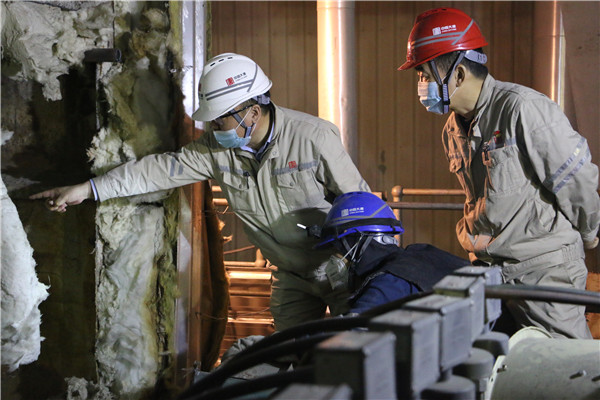 此次消缺期間室外最低氣溫達(dá)到零下20度左右,防寒防凍無(wú)疑是消缺工作的重中之重,長(zhǎng)山廠及時(shí)切換供熱方式,利用化廠備用熱源為家屬區(qū)供熱,同時(shí)也為防寒防凍工作、機(jī)組順利啟動(dòng)提供可靠保證。在此期間,各單位各負(fù)其責(zé),全員行動(dòng),全面開(kāi)展防寒防凍工作。發(fā)電部作為主體責(zé)任部門,從主任到單元長(zhǎng),從值班員到巡檢員,明確區(qū)域,認(rèn)真排查,每小時(shí)測(cè)量廠房所有區(qū)域溫度,同時(shí)對(duì)門窗封閉、室外管路保溫等防寒防凍措施進(jìn)行再次確認(rèn);設(shè)備部一方面制定方案組織相關(guān)單位消缺,一方面全面安排部署極寒天氣下的防寒防凍工作;各車間(分場(chǎng))在生產(chǎn)廠房各層重要部位設(shè)置炭火爐,對(duì)熱控表管表計(jì)、電氣電子間盤(pán)柜、氨區(qū)管路進(jìn)行檢查,增加伴熱帶,設(shè)置值班人員監(jiān)測(cè)環(huán)境溫度,全力以赴確保防寒防凍工作萬(wàn)無(wú)一失。消缺期間,行政事務(wù)部積極做好后勤保障工作,按時(shí)準(zhǔn)備盒飯送到現(xiàn)場(chǎng),助力消缺工作順利完成。