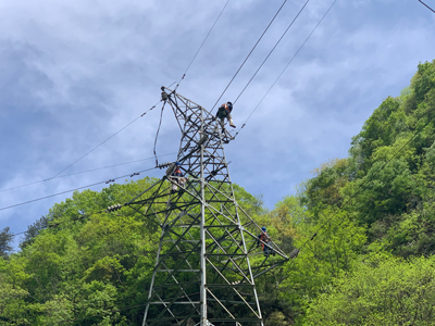 此次維保檢修的二郎壩發(fā)電35kV臥天架空輸配電線路全長約18公里,共有桿塔43級,其中鐵塔22級,混凝土水泥桿塔21級,均為山區(qū)架空線路,且位于陜南山區(qū),叢林密布、道路濕滑,檢修維保工作難度大。施工前,電力運營提前抽調(diào)專業(yè)技術(shù)人員對現(xiàn)場情況進行實地勘察,就天氣情況、檢修方案、危險點進行分析討論,梳理設(shè)備缺陷隱患,并制定了完善的檢修方案及“三措兩案”。檢修人員披荊斬棘、逐桿逐級檢修,共計消除桿塔金具缺陷339條、更換破損絕緣子5片、更換避雷器1組,有效地提高了輸電線路設(shè)備的健康和運行水平,以優(yōu)質(zhì)、高效的檢修成果確保了業(yè)主方輸電線路安全可靠運行。