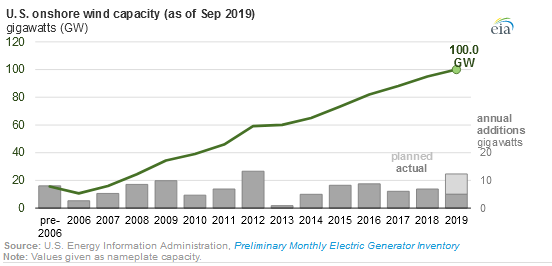 根據(jù)美國(guó)能源信息管理局(EIA)數(shù)據(jù),截至2019年9月,美國(guó)的陸上風(fēng)電累計(jì)裝機(jī)容量已超過100 GW,到2020年底可能達(dá)到122 GW。