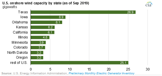 截至2019年第三季度,美國(guó)有41個(gè)州安裝了風(fēng)力渦輪機(jī)。德克薩斯州的裝機(jī)容量最大,為26.9吉瓦,其次是愛荷華州,俄克拉荷馬州和堪薩斯州。這四個(gè)州占美國(guó)總裝機(jī)容量的一半。