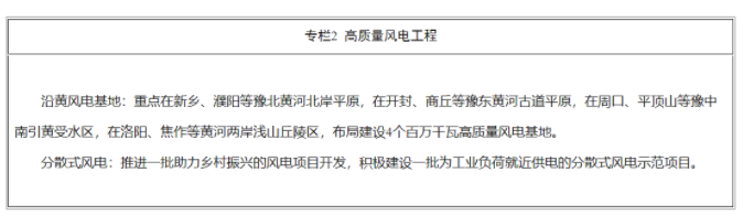 積極推進(jìn)集中式風(fēng)電規(guī)模化開發(fā)。堅(jiān)持生態(tài)環(huán)境優(yōu)先,錨定新增靈活調(diào)節(jié)能力和用電負(fù)荷增長,根據(jù)風(fēng)能資源分布規(guī)律,加快風(fēng)能資源規(guī)?;_發(fā)利用。在京廣鐵路以西及大別山區(qū)域優(yōu)先采用風(fēng)電與傳統(tǒng)電源、抽水蓄能電站一體化開發(fā)模式,打造一批多能互補(bǔ)示范項(xiàng)目;在京廣鐵路以東平原區(qū)域,支持風(fēng)能就近開發(fā)就地消納??茖W(xué)布局沿黃綠色能源廊道,做好水土保持、生態(tài)修復(fù)和林地恢復(fù),以沿黃淺山丘陵和中東部平原地區(qū)為重點(diǎn),加快建設(shè)4個(gè)百萬千瓦高質(zhì)量風(fēng)電基地。