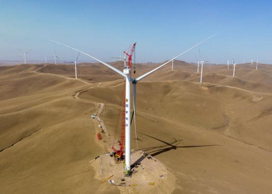 圖為霍林河循環(huán)經(jīng)濟示范工程火電靈活性改造促進市場化消納新能源試點項目30萬千瓦風電項目施工現(xiàn)場,風機葉輪正在吊裝 圖片來源:國家電投內蒙古公司