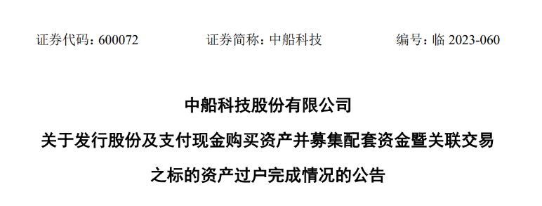 公告披露,截至本公告日,中船科技發(fā)行股份及支付現(xiàn)金購(gòu)買(mǎi)資產(chǎn)并募集配套資金暨關(guān)聯(lián)交易之標(biāo)的資產(chǎn)交割及過(guò)戶手續(xù)已辦理完畢。