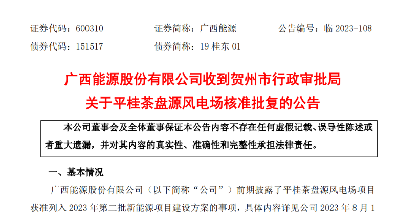 公告披露,2023年11月6日,廣西能源收到《賀州市行政審批局關(guān)于平桂茶盤源風電場核準的批復》(賀審批項目〔2023〕1 號),核準建設(shè)平桂茶盤源風電場項目。
