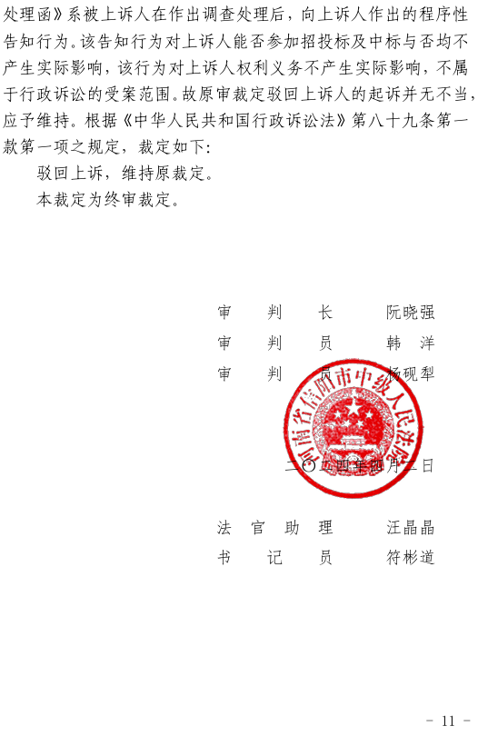附一《河南省信陽市中級人民法院行政裁定書》
