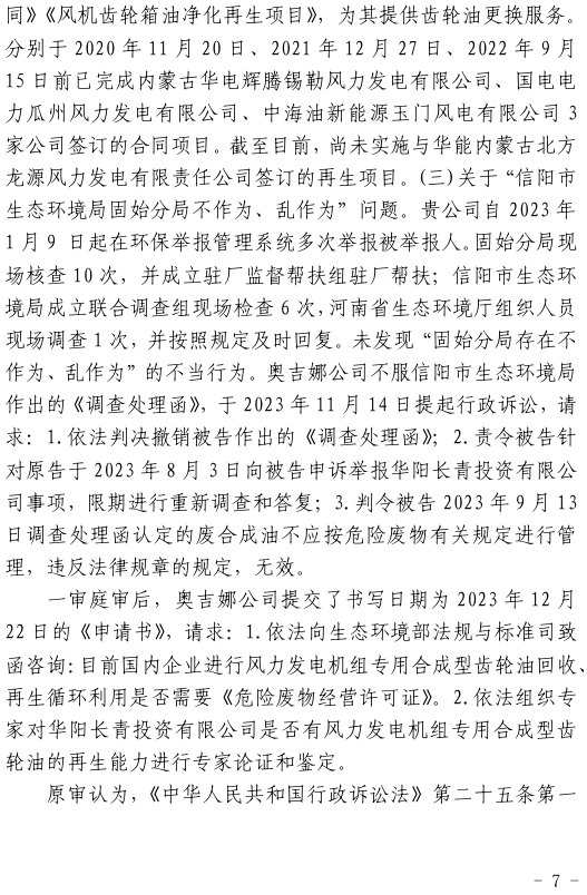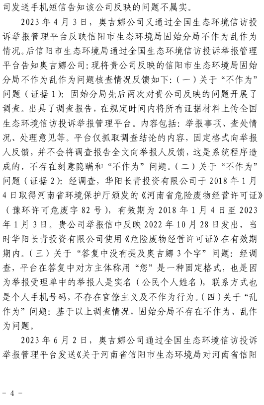 2023年3月9日,奧吉娜公司收到固始分局通過12369環(huán)境信訪平臺的短信答復(fù):“反映問題不屬實”。3月10日,奧吉娜公司向固始分局負責人電話詢問,其解釋稱:經(jīng)調(diào)查核實,華陽長青公司沒有再生風電潤滑油銷售,出售的是新油。否定了奧吉娜公司的舉報內(nèi)容。對此,奧吉娜公司表示強烈不滿。3月11日,奧吉娜公司向環(huán)境部投訴固始分局的不作為和亂作為。2023年5月26日,奧吉娜公司收到12369環(huán)境信訪平臺的短信答復(fù)。答復(fù)部門為信陽環(huán)境局。令人啼笑皆非的是,答復(fù)稱,華陽長青的許可證有效期沒有問題,與舉報內(nèi)容風馬牛不相及。2023年6月13日,奧吉娜公司再次向環(huán)境部提出申訴,指出,奧吉娜舉報的不是許可證有效期問題,而是許可證的適用范圍錯誤、違法。2023年7月27日,奧吉娜公司收到回復(fù)稱,經(jīng)信陽市生態(tài)環(huán)境局現(xiàn)場檢查,未發(fā)現(xiàn)固始分局不作為情況。2023年8月3日,奧吉娜公司向河南省生態(tài)環(huán)境廳(以下稱:環(huán)境廳)舉報信陽環(huán)境局包庇固始分局的行為。環(huán)境廳對此高度重視,有關(guān)處長和奧吉娜公司負責人進行了面談。2023年9月13日,信陽環(huán)境局向奧吉娜公司致《信陽市生態(tài)環(huán)境局關(guān)于沈陽奧吉娜化工有限公司舉報華陽長青投資有限公司違法經(jīng)營及固始分局不作為、亂作為等問題調(diào)查處理的函》。函中:一是,以“齒輪箱”替換“齒輪箱油”,偷換概念;二是,做出了廢風電合成(齒輪)油不屬于危險廢物的結(jié)論;三是,未發(fā)現(xiàn)固始分局存在不作為、亂作為的不當行為。再次否定奧吉娜公司的舉報和投訴。