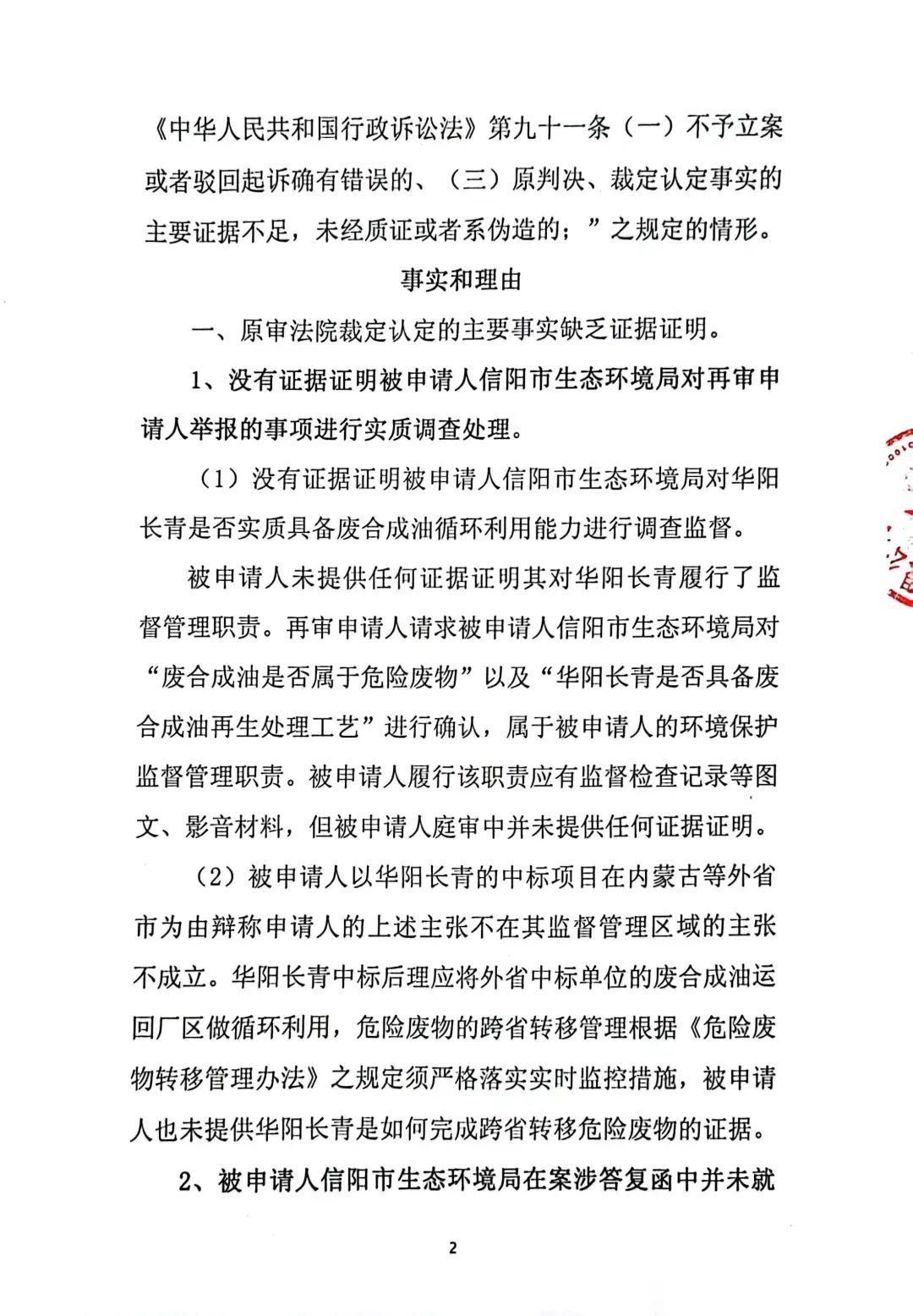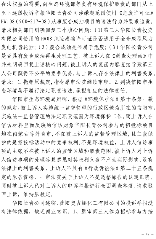 2、一審訴訟請求:請求人民法院判決撤銷被告作出的《信陽市生態(tài)環(huán)境局關(guān)于沈陽奧吉娜化工有限公司舉報華陽長青投資有限公司違法經(jīng)營及固始分局不作為、亂作為等問題調(diào)查處理的函》;責令被告對原告向被告舉報華陽長青投資有限公司事項,限期進行重新調(diào)查和答復(fù);判令被告認定的廢合成油不應(yīng)按危險廢物有關(guān)規(guī)定進行管理違反法律規(guī)章規(guī)定,無效。