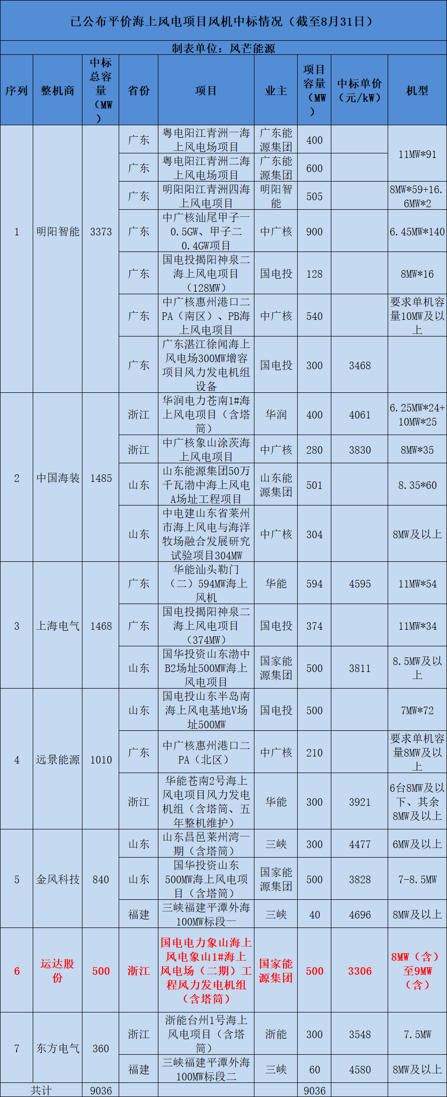 截至目前,國內(nèi)已有9.036GW平價海上風電項目完成風機中標。