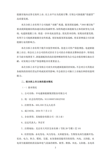 根據(jù)公告,擬拆分的中電建新能源集團股份有限公司注冊資本為60億元,經(jīng)營范圍包括水電發(fā)電、風力發(fā)電、太陽能發(fā)電、生物發(fā)電再生能源開發(fā)等。目前,電建新能源正在推進引入戰(zhàn)略投資者相關(guān)工作。
