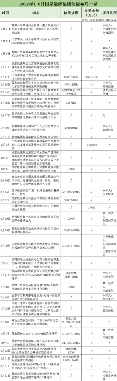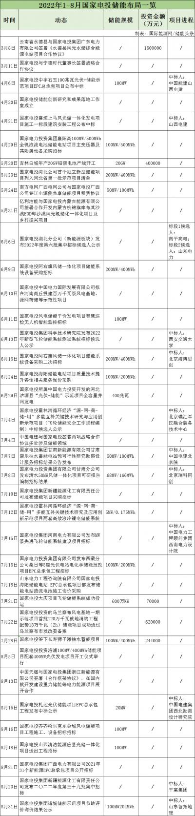 據(jù)不完全統(tǒng)計,2022年1-8月,國家電投與寧德時代、中國電建、中國天楹等簽訂合作協(xié)議,圍繞儲能材料、風(fēng)光氫儲、重力儲能等方面進行合作。儲能項目招標26個,涉及飛輪儲能、液流電池、鉛炭電池、抽水蓄能及智慧新能源等方面。