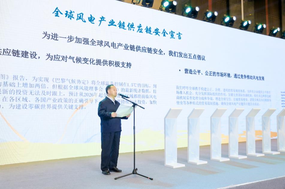 中國職工技術(shù)協(xié)會(huì)副理事長、電力專委會(huì)名譽(yù)會(huì)長畢亞雄,代表全體嘉賓莊嚴(yán)宣讀了《全球風(fēng)電產(chǎn)業(yè)鏈供應(yīng)鏈安全宣言》。