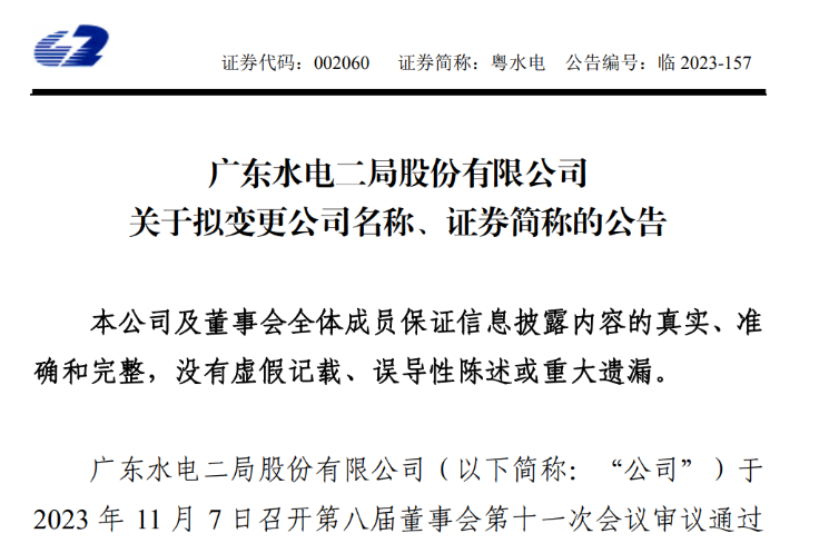 公告披露,粵水電于2023年11月7日召開第八屆董事會第十一次會議審議通過《關(guān)于擬變更公司名稱、證券簡稱的議案》,同意公司名稱由“廣東水電二局股份有限公司”變更為“廣東省建筑工程集團(tuán)股份有限公司”、證券簡稱由“粵水電”變更為“廣東建工”。
