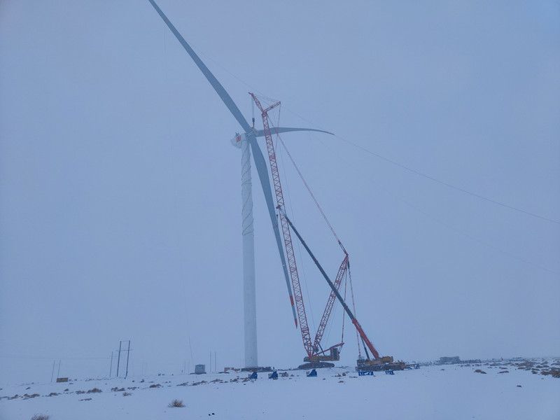 11月27日,在最后一臺風(fēng)機(jī)的吊裝現(xiàn)場,面對施工環(huán)境的變化和溫度驟降,現(xiàn)場的吊裝工作人員顯得格外謹(jǐn)慎,伴隨著對講機(jī)中不斷傳來的指令,主吊司機(jī)小心翼翼撥動著操縱桿,司索工有的放矢牽引著纜風(fēng)繩,安裝工井然有序,所有人不懼嚴(yán)寒堅守在各自崗位上,將巨大的風(fēng)機(jī)葉輪緩緩吊起;到達(dá)指定高度后,原本平行的葉輪逐漸轉(zhuǎn)為垂直并緩慢地向主機(jī)艙靠近;經(jīng)過多次精準(zhǔn)的調(diào)整,風(fēng)機(jī)葉輪終于與主機(jī)實(shí)現(xiàn)完美對接……吊裝團(tuán)隊在經(jīng)歷了50多個小時的緊張作業(yè)后,風(fēng)機(jī)像一位全副武裝的鋼鐵巨人張開臂膀屹立在天地之間,在隨風(fēng)飄蕩的雪花和不遠(yuǎn)處其他小型風(fēng)機(jī)的襯托下,更顯現(xiàn)出它的挺拔宏偉。