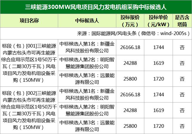 其中金風(fēng)科技投標(biāo)報(bào)價(jià)均為26166.18萬(wàn)元,投標(biāo)單價(jià)均為1744元/kW(不含塔筒);