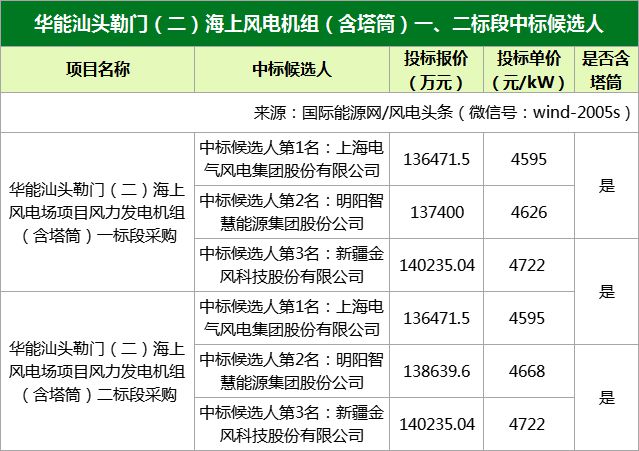 華能汕頭勒門(二)海上風(fēng)電場(chǎng)項(xiàng)目風(fēng)力發(fā)電機(jī)組(含塔筒)采購(gòu)一、二標(biāo)段中標(biāo)候選人分別為上海電氣、明陽(yáng)智能、金風(fēng)科技。