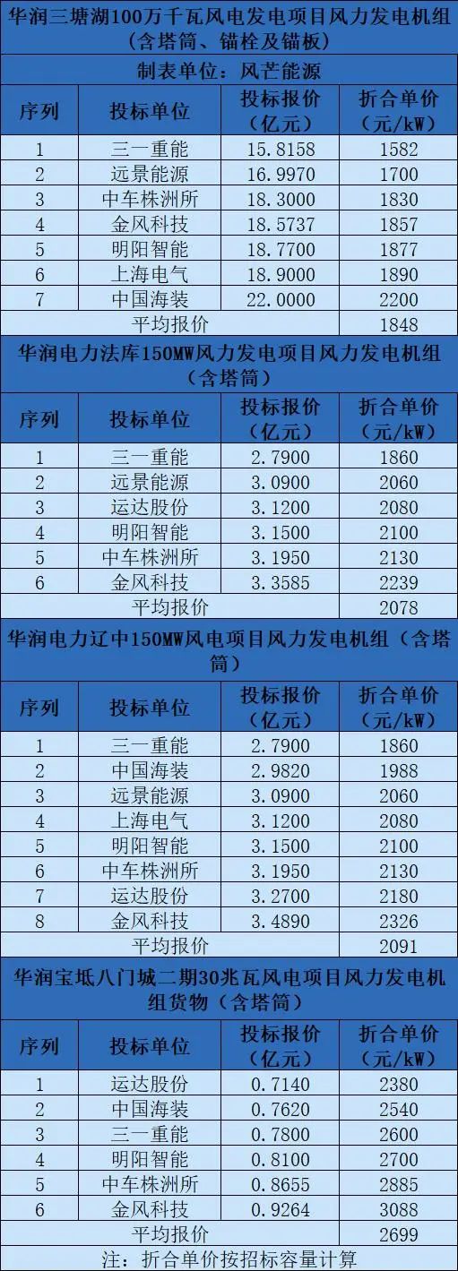 10月11日,華潤4個風機采購項目共計1.33GW開標。其中,華潤三塘湖1GW風機(含塔筒、錨栓)采購項目共有7家整機商競標,最高投標報價22億元,折合單位2200元/kW;最低投標報價為15.8158億元,折合單價為1582元/kW。減去塔筒、錨栓價格(按輕量化,保守350元/kW來算),最低報價裸機價格僅約1232元/kW。該報價為風機價格歷史最低點。