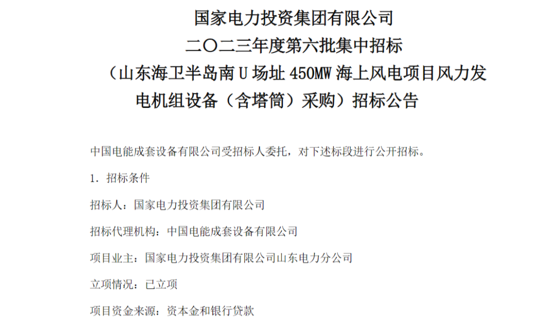 近日,國家電投發(fā)布《國家電力投資集團有限公司二〇二三年度第六批集中招標(biāo)(山東海衛(wèi)半島南 U場址 450MW海上風(fēng)電項目風(fēng)力發(fā)電機組設(shè)備(含塔筒)采購)招標(biāo)公告》。