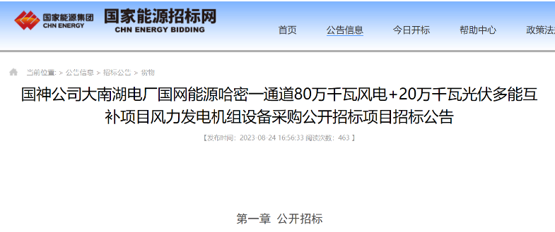 公告顯示,國網能源哈密一通道80萬千瓦風電+20萬千瓦光伏多能互補項目場址位于新疆哈密大南湖地區(qū),工程場址中心距哈密市直線距離約96km,呈不規(guī)則多邊形,占地面積約165.05km²,風電場擬安裝128臺6.25MW風力發(fā)電機組,總裝機容量800MW,共分為兩個標段:A標段400MW,B標段400MW。本項目計劃于2023年9月30日前開工(暫定);2024年6月30日前全容量并網發(fā)電。(暫定)