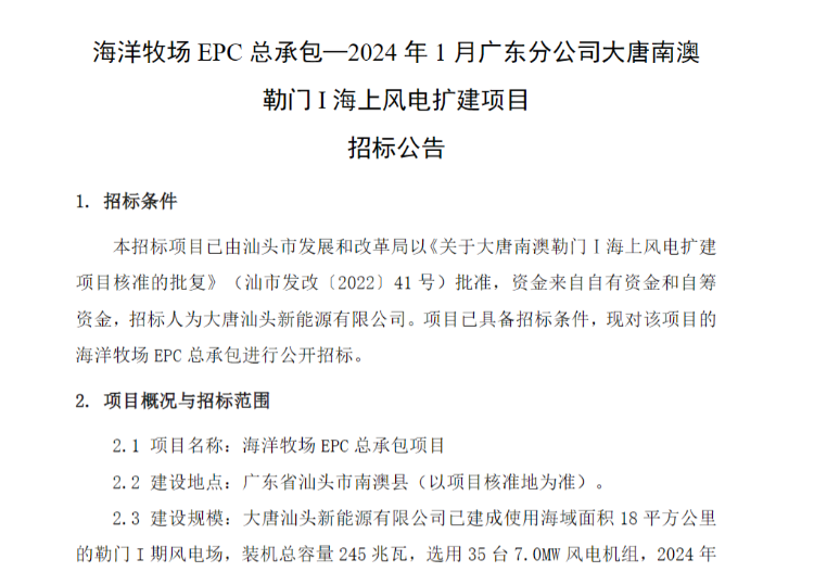 招標(biāo)范圍:本次招標(biāo)為大唐南澳勒門 I 海上風(fēng)電擴(kuò)建項(xiàng)目海洋牧場 EPC總承包工程,包括但不限于勘察設(shè)計(jì)、采購、運(yùn)輸、施工、調(diào)試、驗(yàn)收、質(zhì)量保證服務(wù)(含 CCS 檢測認(rèn)證、三同時(shí))等全部工作及招標(biāo)技術(shù)文件規(guī)定的其它工作,具體工作范圍詳見技術(shù)規(guī)范書。