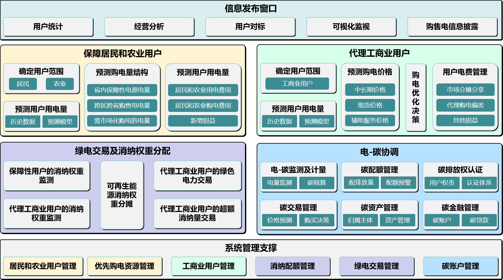 2021年11月30日,信產(chǎn)中電普華公司在能源研究會(huì)能源互聯(lián)網(wǎng)專委會(huì)上發(fā)布代理購(gòu)電決策支撐工具平臺(tái)。代理購(gòu)電決策支撐工具平臺(tái)的主要功能包括:保障居民與農(nóng)業(yè)用戶管理、代理工商業(yè)用戶管理、綠電交易及消納權(quán)重分配管理、電碳協(xié)調(diào)管理、信息發(fā)布窗口及系統(tǒng)管理支撐功能六大功能模塊。