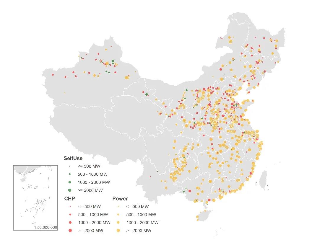 圖1 中國(guó)現(xiàn)役燃煤電廠的分布,應(yīng)用領(lǐng)域及裝機(jī)容量