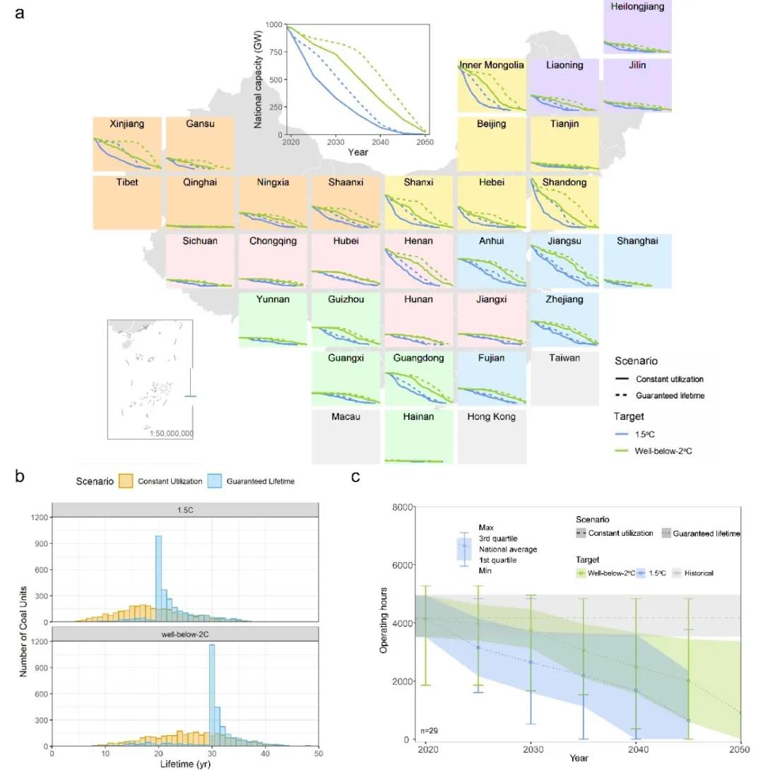 基于這套系統(tǒng)性的煤電機(jī)組退出策略,以及與1.5°C和2°C目標(biāo)相匹配的煤電機(jī)組退出路徑,研究者們?cè)O(shè)計(jì)并分析了兩種電廠退役情景——保持機(jī)組利用小時(shí)和保障機(jī)組運(yùn)行年限(圖2a)。在保持機(jī)組利用小時(shí)的退役情景下,在全國(guó)煤電發(fā)電量的約束下,每個(gè)機(jī)組的退役時(shí)間則是根據(jù)其多指標(biāo)退役優(yōu)先級(jí)逐個(gè)關(guān)停,大多數(shù)機(jī)組將在達(dá)到20 或30 年的保障年限之前退役(圖2b)。