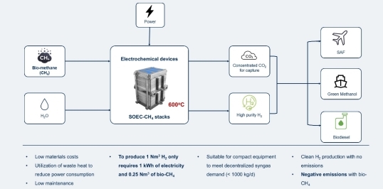 采用更先進(jìn)的電化學(xué)路線,將生物天然氣、綠電、水輸入電堆,在600℃運(yùn)行溫度下,同時(shí)產(chǎn)出高純度綠氫和自富集的CO2,一次性解決綠色燃料合成時(shí)的兩大重點(diǎn)原料的來源問題。不僅簡(jiǎn)化了流程,更縮減了成本。在其他項(xiàng)目仍在使用其他電解水制氫裝備,以3-5度/標(biāo)方的電耗制取綠氫,同時(shí)增設(shè)空氣捕集裝置來捕集CO2時(shí)。電堆科技已經(jīng)做到,制取1標(biāo)方氫氣,僅需1度電及0.25標(biāo)方生物天然氣,且無需增設(shè)空氣捕集裝置。