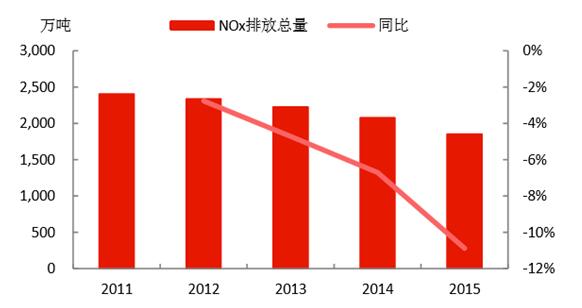 經(jīng)過(guò)“十二五”的治理,四項(xiàng)污染物減排約束性指標(biāo)均實(shí)現(xiàn)了持續(xù)下降,完成了“十二五”的減排任務(wù),取得了一定的環(huán)保成果。2015年:1)COD的排放量為2224萬(wàn)噸,且每年以3%左右的速度下降;2)氨氮的排放量為230萬(wàn)噸,且每年以3%左右的速度下降;3)SO2的排放量為1859萬(wàn)噸,每年基本以4%左右的速度下降,而收關(guān)年2015年下降速度高達(dá)5.84%;4)NOx的排放量為1852萬(wàn)噸,“十二五”剛開(kāi)始治理,當(dāng)前的下降速度還處于上升趨勢(shì),收關(guān)年2015年下降速度高達(dá)10.89%。