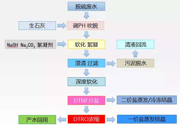 第一種是DTRO膜濃縮+蒸發(fā)結(jié)晶法,該方法可以回收水資源和結(jié)晶鹽,完全符合政府要求廢水“零排放”要求。DTRO膜系統(tǒng)對(duì)廢水的高倍濃縮大大降低了零排放成本。此外,為了確保蒸發(fā)結(jié)晶器正常運(yùn)行和保證結(jié)晶鹽品質(zhì),需要對(duì)脫硫廢水進(jìn)行嚴(yán)格的預(yù)處理,如去除廢水中的硬度、有機(jī)物和重金屬等。因此,要實(shí)現(xiàn)蒸發(fā)結(jié)晶法的大規(guī)模應(yīng)用,必須注重強(qiáng)開發(fā)廢水減量化預(yù)處理技術(shù)的研發(fā),以期降低蒸發(fā)工段的建設(shè)和和運(yùn)行成本,同時(shí)還要研究高效的脫硫廢水預(yù)處理技術(shù)。