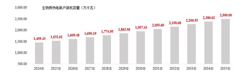根據(jù)國家發(fā)展改革委、國家能源局發(fā)布的《關(guān)于促進(jìn)生物質(zhì)能供熱發(fā)展的指導(dǎo)意見》(發(fā)改能源[2017]2123號(hào)),到2035年,生物質(zhì)熱電聯(lián)產(chǎn)裝機(jī)容量超過2500萬千瓦,生物質(zhì)能供熱在具備資源條件的地區(qū)實(shí)現(xiàn)普及應(yīng)用。根據(jù)該指導(dǎo)意見確定的目標(biāo),未來生物質(zhì)熱電聯(lián)產(chǎn)裝機(jī)容量預(yù)計(jì)發(fā)展情況如下: