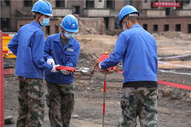 演習(xí)當(dāng)天,隨著警報(bào)聲響,接到指令后演練緊張而有序地進(jìn)行著。所有參演人員在現(xiàn)場(chǎng)統(tǒng)一指揮協(xié)調(diào)下,明確責(zé)任分工,迅速前往故障點(diǎn)開展故障巡視消缺。巡視組成員到達(dá)故障地點(diǎn),發(fā)現(xiàn)故障原因?yàn)闉趵兆冸娬?204、9206 同桿雙回線路因發(fā)生地震災(zāi)害導(dǎo)致桿塔傾斜,桿上連接金具變形。隨即指揮組制定恢復(fù)供電方案,檢修人員立刻準(zhǔn)備好搶修工器具,前往故障點(diǎn)執(zhí)行操作指揮搶修工作,整個(gè)演練過程有條不紊。