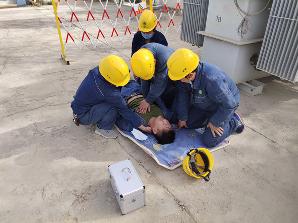 隨著現(xiàn)場總指揮所長李建亞一聲令下,觸電事故應(yīng)急演練拉開序幕?,F(xiàn)場模擬一名檢修人員在進行故障處理過程中,不慎發(fā)生觸電,現(xiàn)場工作負責(zé)人立即斷開電源并向負責(zé)人匯報現(xiàn)場情況,同時撥打求救電話,現(xiàn)場搶險組、醫(yī)療救護組、人員疏散組、后勤保障組等馬上集結(jié)并展開了行動,對觸電人員進行心肺復(fù)蘇法救援,并在周邊設(shè)置警戒線,保持交通順暢。在演練現(xiàn)場,安全員向參培人員詳細講解了觸電急救、心肺復(fù)蘇及胸外心臟按壓等救援理論知識,并進行施救演示,參培人員輪流進行施救操作,通過理論學(xué)習(xí)和實際操作,很快掌握了正確的急救方法和要領(lǐng)。