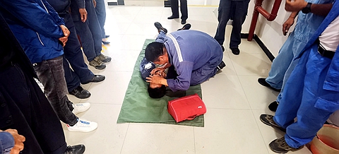 演練模擬大寺鄉(xiāng)發(fā)生6.5級(jí)破壞性地震,供電所辦公樓開(kāi)始搖晃,指揮長(zhǎng)嚴(yán)世莊大聲呼喊吹哨,各樓層內(nèi)所有人員立即采取正確的避震措施,迅速抱頭尋找最近的墻角、柱角、堅(jiān)固高大的桌下、柜旁或開(kāi)間小的衛(wèi)生間、內(nèi)承重墻墻角蹲下、抱頭、閉眼,抓牢或握實(shí)以盡量固定身體,使用安全帽等保護(hù)頭部,降低身體重心。隨著指揮長(zhǎng)第二次呼喊緊急撤離,各樓層緊急組織人員安全迅速?gòu)陌踩付ò踩ǖ朗枭⒌街付ň奂c(diǎn),過(guò)程中員工互相呼喚、提醒避震。撤離后清點(diǎn)發(fā)現(xiàn)1人失蹤,急救組立刻對(duì)失蹤人員進(jìn)行搜救,搜救人員在二樓辦公室發(fā)現(xiàn)失蹤人躺在地上,左手臂被傾倒的辦公桌壓住,造成骨折,同時(shí)發(fā)現(xiàn)兩根0.22KV電線(鋁塑線)達(dá)在傷員身上,并正通有電源,傷員無(wú)意識(shí),心跳呼吸停止同時(shí)發(fā)生人員觸電,搜救人員立即斷開(kāi)有關(guān)電源,用木棒挑開(kāi)電線,迅速轉(zhuǎn)移傷員至安全地帶后對(duì)其進(jìn)行心肺復(fù)蘇和外傷急救,并撥打120急救電話。經(jīng)全力搶救,傷員已恢復(fù)自主心跳和呼吸,搶救人員對(duì)其進(jìn)行外傷包扎后就地觀察,等待120急救人員到來(lái),同時(shí)有人員報(bào)告一樓安全工器具室發(fā)生火災(zāi),指揮組迅速組織人員對(duì)著火點(diǎn)進(jìn)行滅火器滅火。