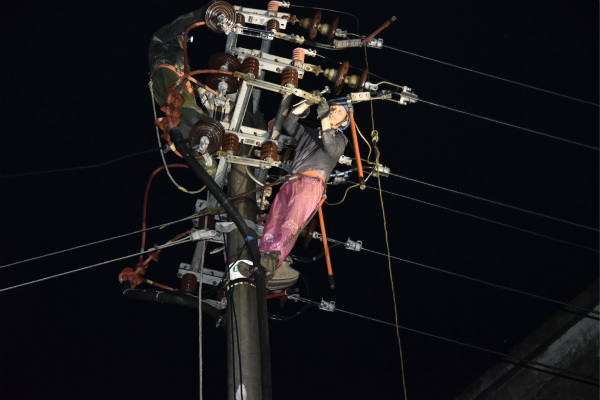 該線路斷線區(qū)域處于陡坡地勢(shì)復(fù)雜,且雨天較滑,搶修放線工作難度較大。在各部門的討論部署下,23名搶修人員做好搶修準(zhǔn)備工作趕往現(xiàn)場(chǎng)。盡管多方面原因?qū)е聯(lián)屝揠y度大、任務(wù)重,但搶修人員毫無(wú)怨言,大家只想讓停電用戶能夠盡早用上電。雨勢(shì)稍有減停,晚上8時(shí)在調(diào)度部門的許可下斷開10千伏亨泰線開關(guān),搶修人員做好相關(guān)安全防護(hù)措施,搶修工作有序進(jìn)行......