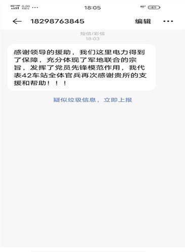 中國(guó)電力網(wǎng)訊 “感謝貴所的援助,我們這里電力得到了保障,充分體現(xiàn)了軍地聯(lián)合的宗旨,發(fā)揮了黨員先鋒模范作用,我代表42號(hào)車站全體官兵再次感謝貴所的支援和幫助!”這是一份來(lái)自國(guó)網(wǎng)甘肅肅南縣供電公司蓮花供電所管轄范圍內(nèi)的解放軍42號(hào)車站站長(zhǎng)發(fā)來(lái)的感謝短信,這份不尋常的感謝短信里表達(dá)著他們對(duì)該公司搶修人員快速解決部隊(duì)用電故障的感激之情。