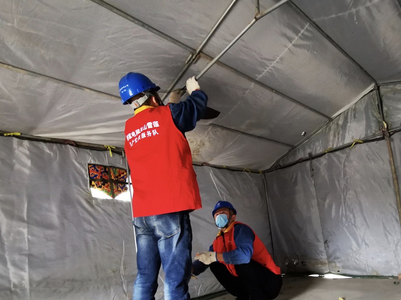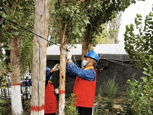 還沒休息幾分鐘又接到伊寧縣奎太買里村委會電話,“夏師傅,村委會要在村口建一個疫情檢查點,需要接電照明,你們趕緊來處理一下。”黨員服務(wù)隊隊員夏文亮與他的搭檔做好消毒工作后,帶上安全工器具立即前往村委會防疫點,經(jīng)過半個多小時的工作,村委會防疫點帳篷內(nèi)照明燈亮起來了。