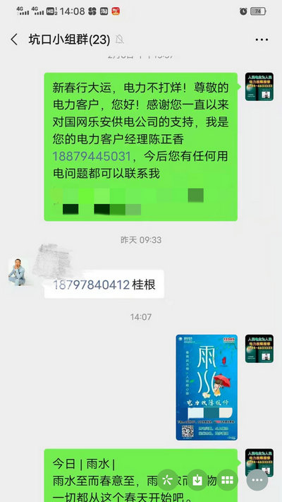 隨著智能通信時代的來臨,微信這一網(wǎng)絡(luò)軟件已成為人們重要的日常交流工具,通過微信群和客戶溝通交流,既省時省力,又方便快捷,有效地拉近了雙方的距離。為了更好地開展供電服務(wù)工作,樂安縣公司臺區(qū)客戶經(jīng)理早前就已經(jīng)自建或主動加入管理區(qū)域的村委、社區(qū)微信群,隨時將停電信息、線路搶修、電費回收、節(jié)約和安全用電知識等信息在群中公告和提醒。同時,客戶也可以通過微信群@客戶經(jīng)理,咨詢用電服務(wù)、了解供電信息、反映用電問題,在第一時間獲得供電服務(wù)。